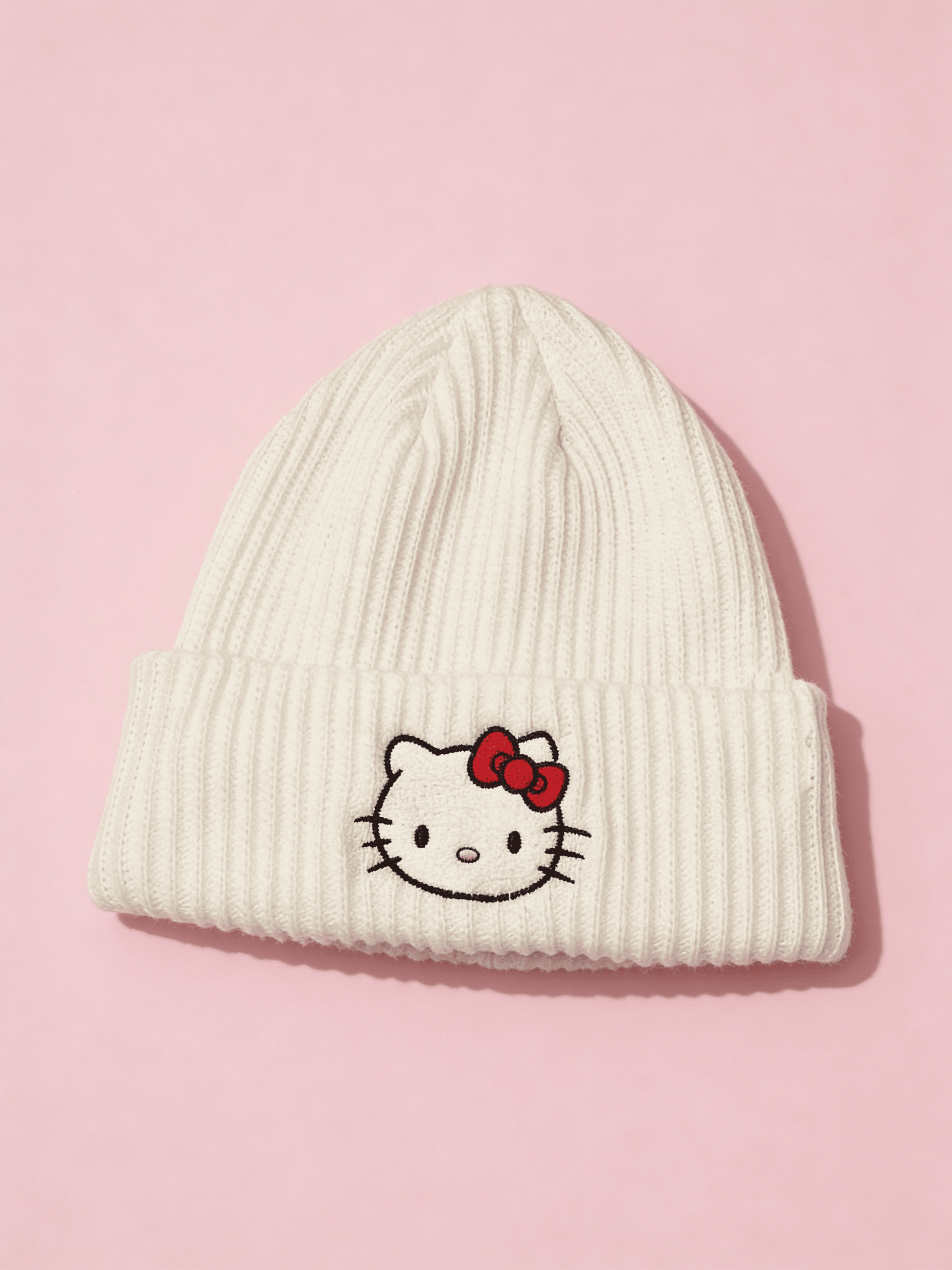 Stay warm in style with this adorable Hello Kitty beanie! Made from high-quality material that is soft, comfortable, and perfect for chilly winter days. This white knitted beanie is adorned with the iconic Hello Kitty embroidery featuring a red bow, adding a touch of flair to your outfit. A perfect gift for Hello Kitty fans and lovers of fashionable accessories!